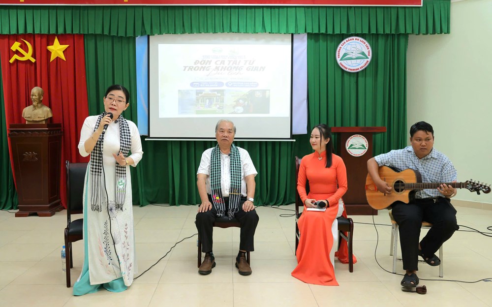 Buổi giao lưu không chỉ là học lý thuyết, mà có minh hoạ trực tiếp. NNƯT Kiều Nga, Phó Giám đốc Trung tâm Văn hóa – Nghệ thuật TP Cần Thơ, biểu diễn các trích đoạn để sinh viên cảm nhận lắng đờn, trải hơi — kỹ thuật khó nhưng quan trọng giúp chuyển đổi âm nhạc thành trải nghiệm, không chỉ để nghe mà để “đi vào lòng”.