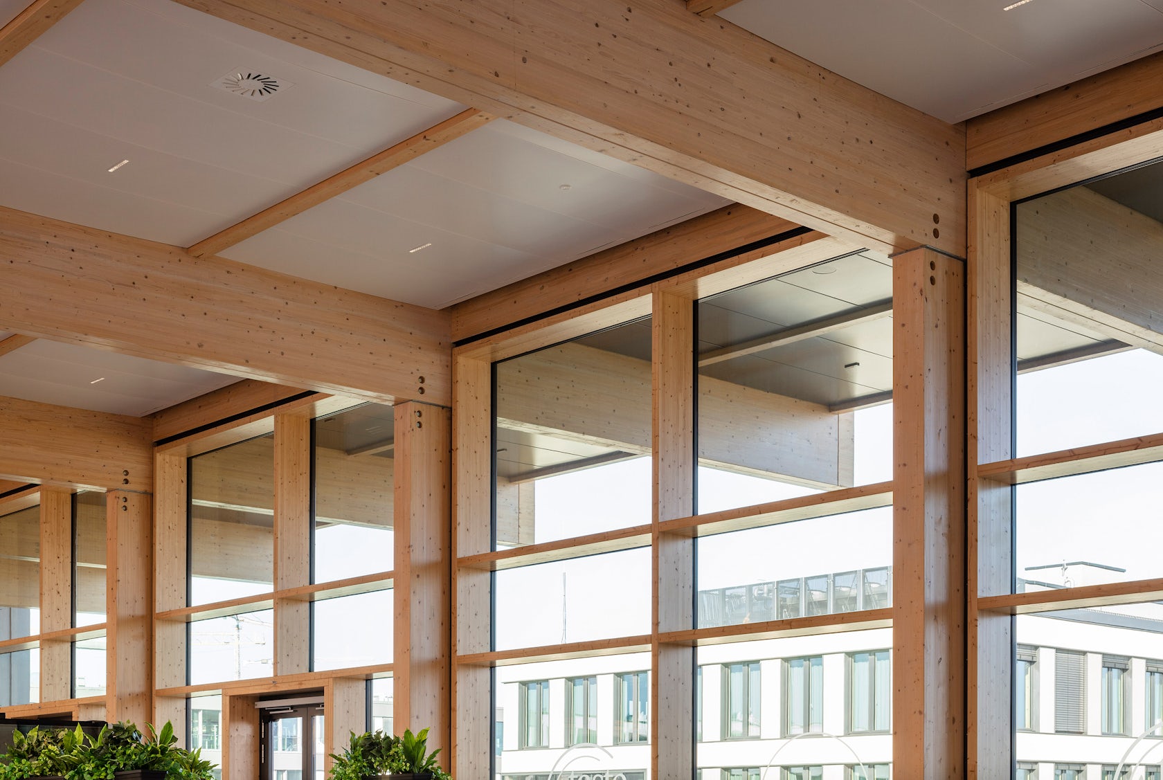 Ngoài ra, bên dưới mái lợp lá kim loại là bốn cột gỗ vân sam hình thân cây, trải dài từ sàn đến trần như một nhà kính. Dưới chân mỗi cột là không gian xanh, bao quanh là khu vực sinh hoạt cộng đồng và ẩm thực. Các "cây" mang theo các cấu trúc sàn để giải trí và thư giãn ở nhiều độ cao khác nhau. Các bậc thang tinh xảo với lan can trắng nối liền các sàn và dẫn lên các tầng văn phòng. Trên tầng năm là một phòng chờ trên cao với tầm nhìn ra quang cảnh thành phố và sân thượng ngoài trời. Gỗ được sử dụng khắp tòa nhà để làm dầm đỡ và điểm nhấn trang trí, mang đến cho khu phức hợp một diện mạo lai thực sự. Ý tưởng thiết kế này được phát triển bởi de Winder Architekten Berlin.