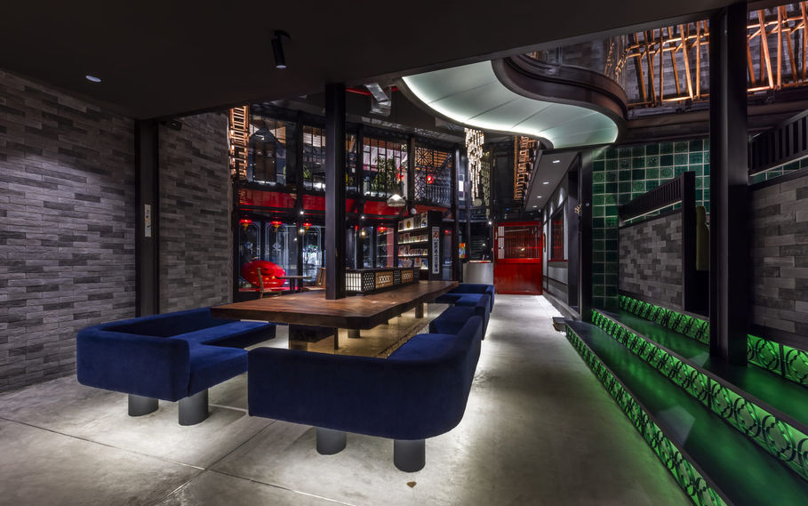 In order not to make it excessively Chinese or Japanese style, the industrial feel of aluminum furniture and table tops, and exposed piping created a space where the uniqueness of these disparate materials resonates. These effects allow customers to have a special experience no matter which seat they occupy. Furthermore, the attractively designed passageways and staircases allow people to enjoy the changing sequence by allowing them to see the various spaces on the upper and lower floors.
