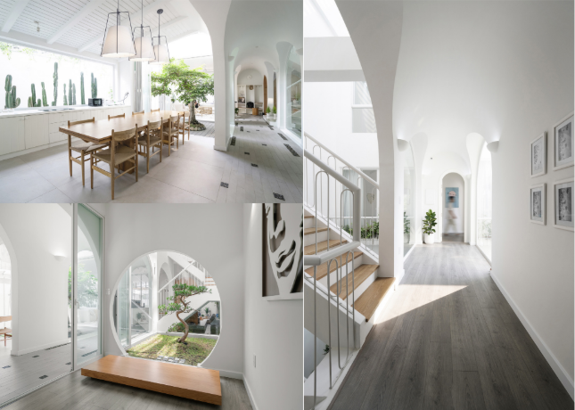 Để đáp ứng yêu cầu đó, thiết kế sử dụng các đường cong mềm mại, uyển chuyển nhằm phá vỡ hình thái cứng nhắc của kiểu nhà ống truyền thống. Mỗi tầng đều được tích hợp ban công xanh, các khoảng thông tầng, không gian đệm và khoảng trống xen kẽ, giúp cải thiện thông gió tự nhiên và tạo chiều sâu không gian.