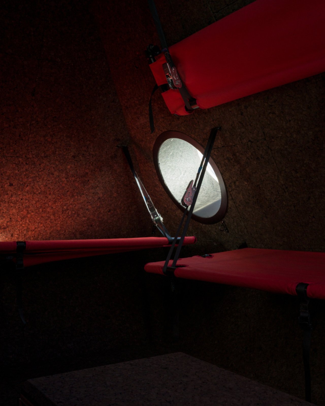 Bên trong, lớp cách nhiệt và cách âm bằng nút tự nhiên tạo ra không gian ấm áp bất ngờ giữa điều kiện khắc nghiệt của núi cao. Không gian được thiết kế để chứa tới 9 người nhờ bố trí giường thông minh gắn vào tường, chỉ mở ra khi cần. Phần lớn thời gian, lều có thể trống hoặc chỉ chứa một vài người leo núi, nhưng trong trường hợp khẩn cấp, từng centimet bên trong đều quan trọng.