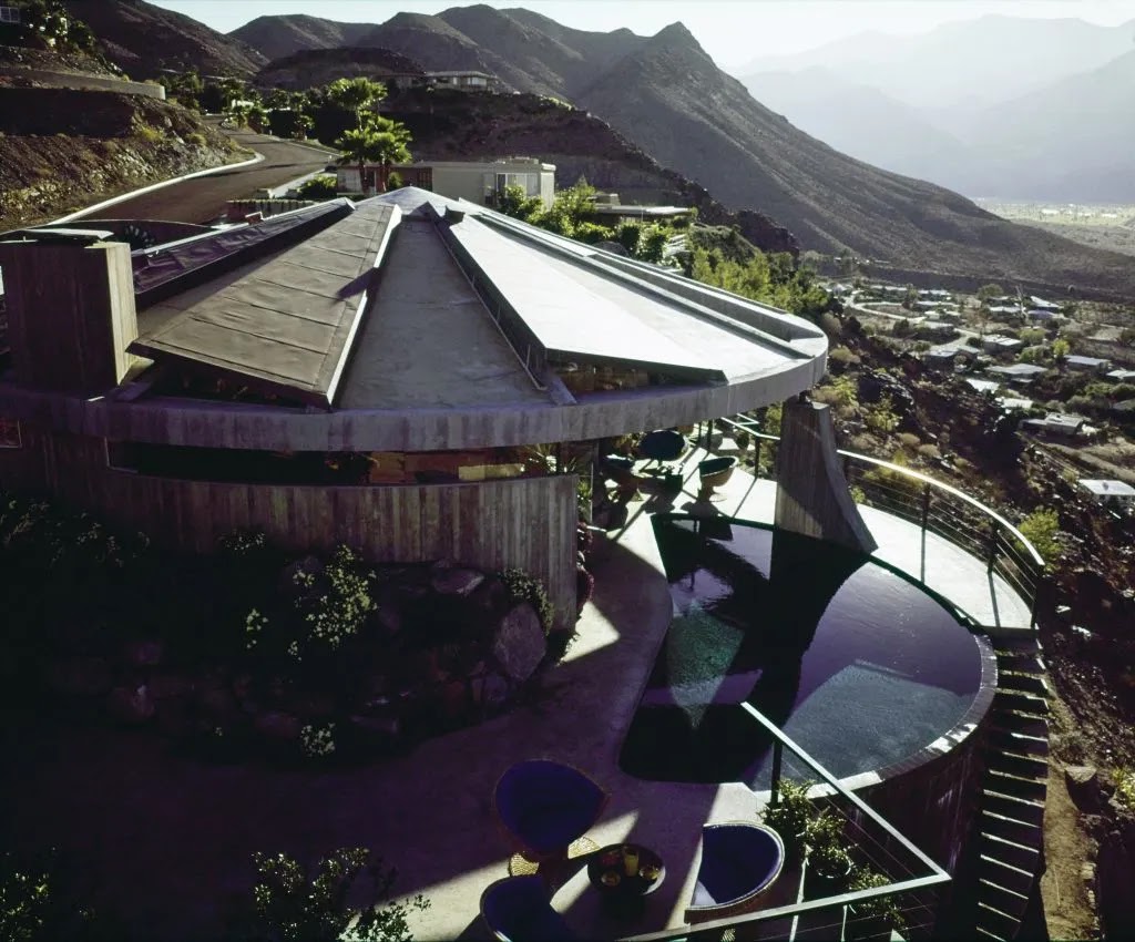 Ngôi nhà nổi bật với mái vòm khổng lồ, kết hợp ánh sáng, thông gió, và các tảng đá lớn trong không gian sống, xóa nhòa ranh giới trong – ngoài, mang đậm tính drama điện ảnh của kiến trúc California hiện đại.