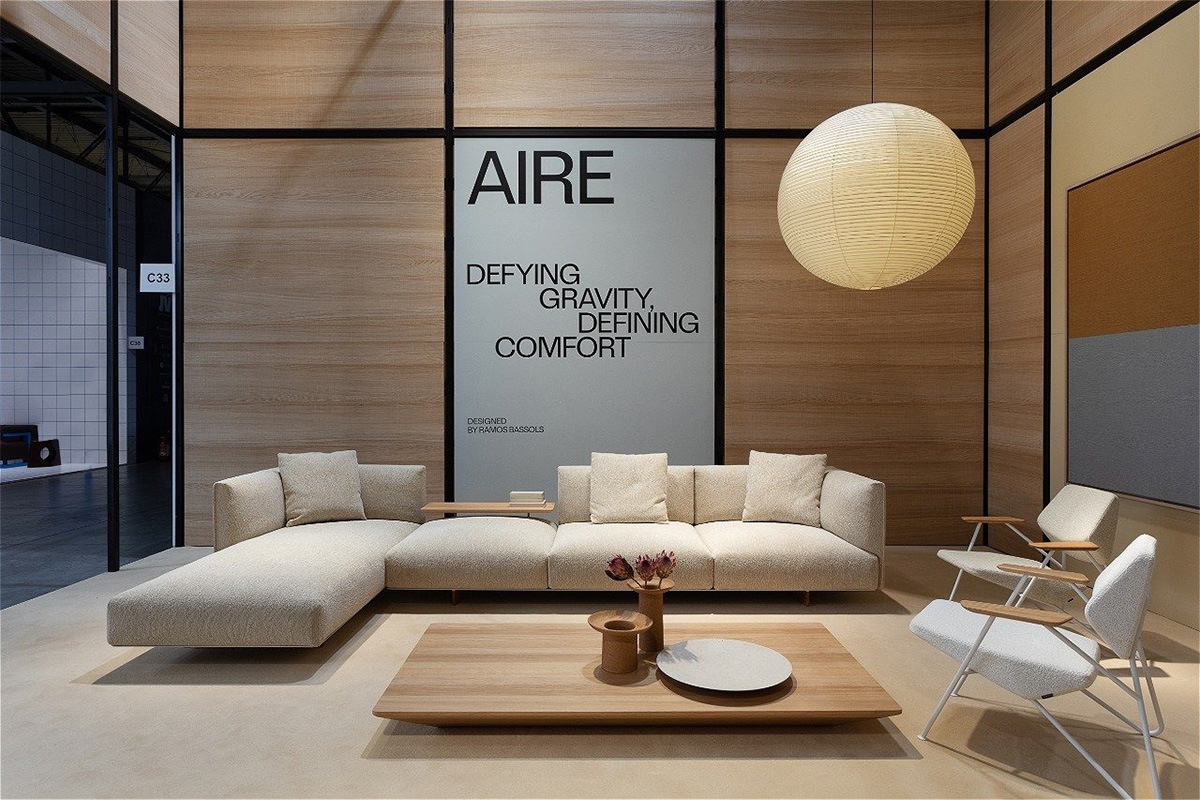 “Chúng tôi mô tả Aire bằng một từ: tự do – tự do thích nghi, tự do thoải mái, tự do trong cách sắp xếp. Đây là một sofa được thiết kế để linh hoạt,” Ramos+Bassols chia sẻ. Các khoảng cách tinh tế giữa các thành phần tạo ra không gian âm dưới khung, đồng thời chân đỡ hở cho phép thêm các module phụ như bàn cạnh hay bàn đầu ghế, dễ dàng điều chỉnh bố cục tổng thể. Tay vịn và các thành phần bàn được tích hợp mượt mà, giúp sofa thích nghi với nhiều cấu hình khác nhau. Các đường may bọc luôn mượt mà, duy trì sự liền mạch cả về hình thức lẫn cấu trúc.