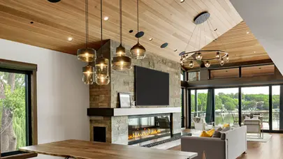 Khu vực chính gồm phòng khách, bếp và bốn phòng ngủ được bố trí ở độ cao có tầm nhìn lý tưởng. Nhờ đó, chỉ cần mở cửa sổ là có thể nhìn thấy biển mây và rừng thông trải dài.