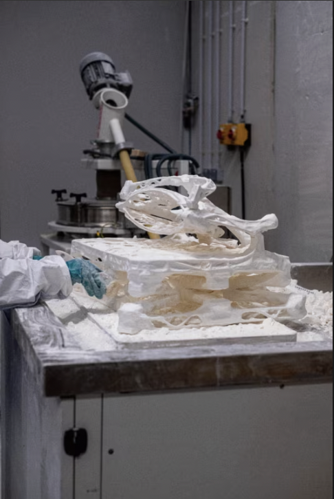 Các chi tiết được in 3D dạng phẳng, sử dụng kỹ thuật sinter hóa bột polymer. Vật liệu chỉ xuất hiện tại các điểm thực sự cần thiết về mặt cấu trúc; phần mềm đã tính toán liều lượng chính xác trước khi in, giúp giảm lãng phí và tăng độ nhẹ cho sản phẩm.