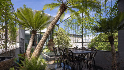 Điểm nhấn thị giác và không gian của boutique là bốn pavilion gỗ tần bì khổng lồ, đặt trọn trong thể tích hồ bơi cũ. Những “túp lều” này mang hình thái hữu cơ, gợi liên tưởng đến tổ chim, sinh vật biển, hay ký ức tuổi thơ – vừa lạ lẫm, vừa gần gũi.