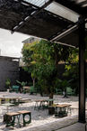 Ván ép phủ phim được sử dụng một cách sáng tạo cho hàng rào và một số yếu tố nội thất, tạo nên một bề mặt thô mộc và đầy cá tính. Vật liệu này không chỉ tiết kiệm chi phí thi công mà còn phản ánh thái độ khiêm nhường và thực tiễn của nhóm thiết kế. Gỗ tự nhiên được sử dụng cho các món đồ nội thất, tạo nên sự ấm áp và dễ chịu cho không gian cafe bên dưới.