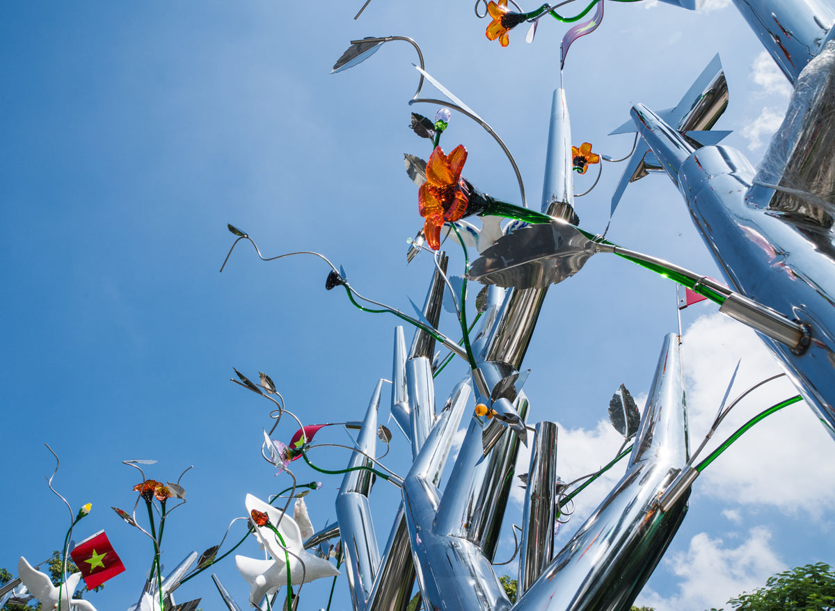 Ngay từ cổng vào, cánh cửa gỗ hình vòm cùng tường phù điêu hoa lá mở ra cảm giác chào đón.