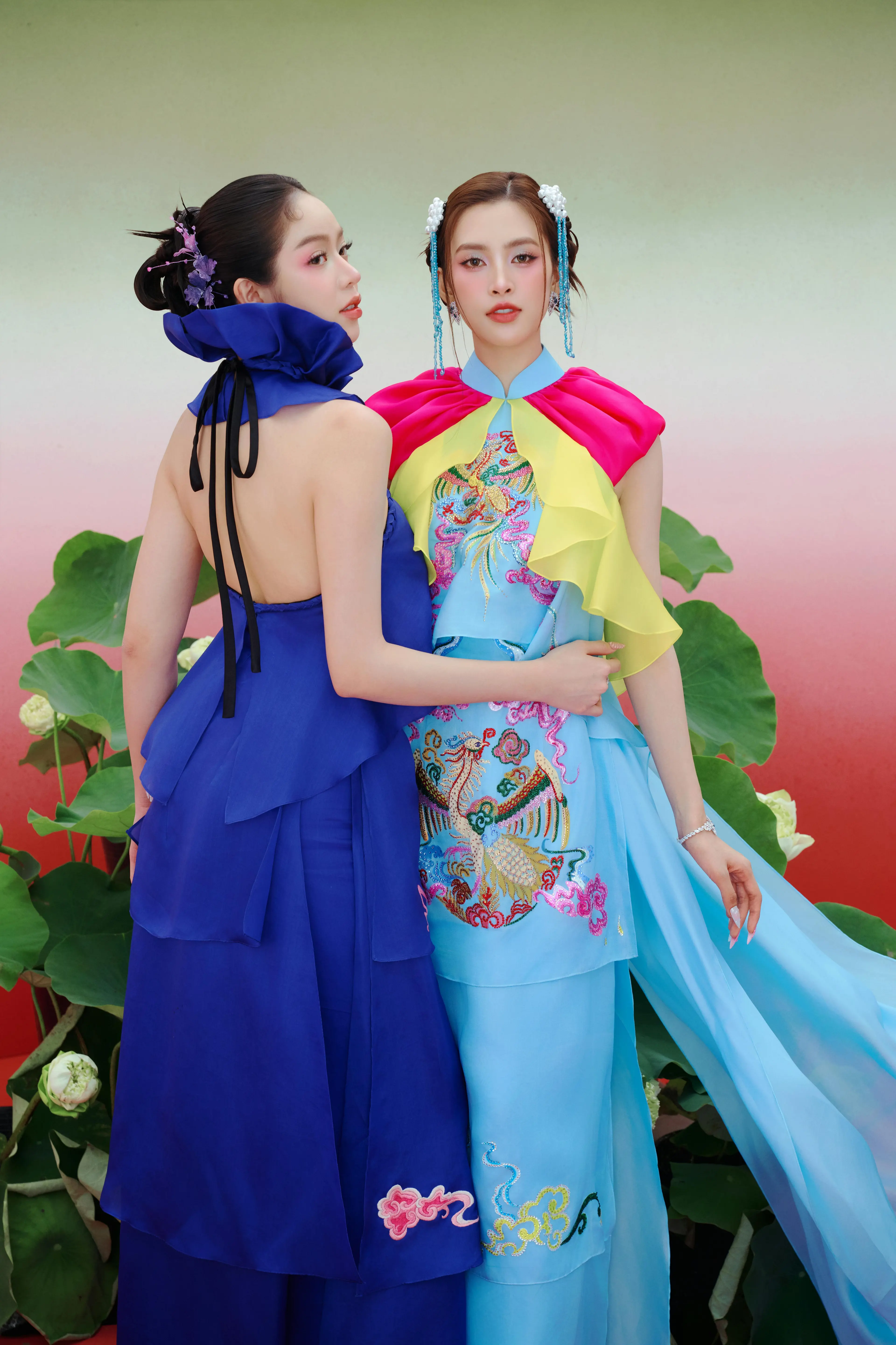 Điểm nhấn trong thiết kế nằm ở cách xử lý layer xếp tầng ở ngực và vai – vừa phá cách, vừa giữ được dáng áo dài truyền thống. Các đường cắt, cách xử lý chất liệu và bố cục họa tiết đều được tính toán kỹ lưỡng, giúp tôn vinh thần thái và vẻ đẹp mỹ miều của các nàng hậu, đồng thời đưa áo dài Việt tiến gần hơn tới chuẩn mực couture.