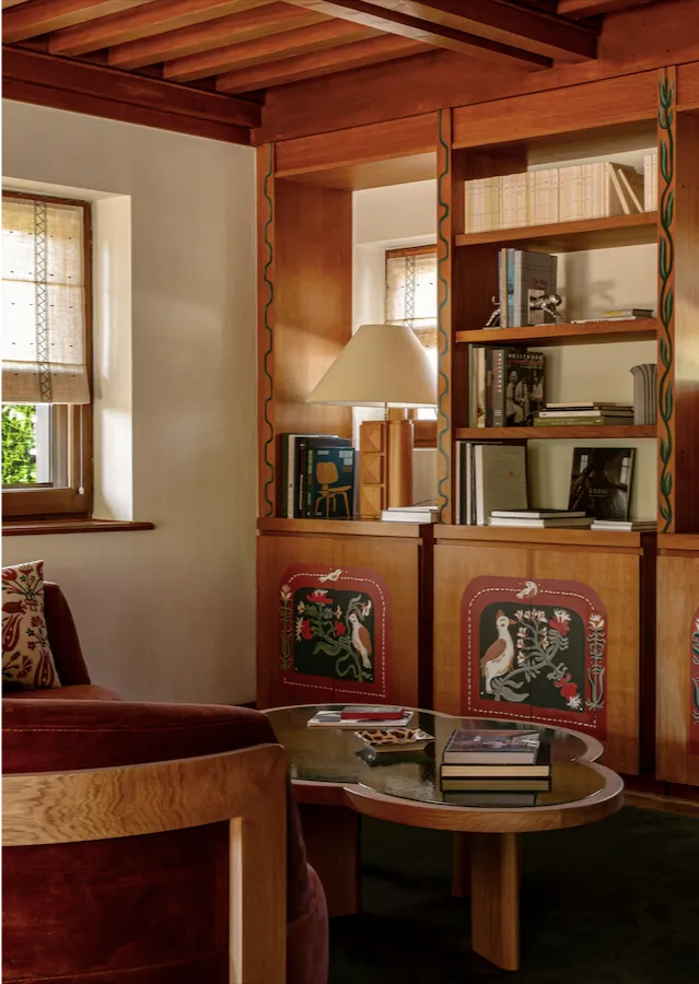 Studio đã kết hợp các vật dụng theo thời kỳ và vintage với các sáng tạo đương đại: các điểm nhấn gồm bích họa của Louise Defente trong thư viện, gốm tường của Héloïse Rival trong phòng tắm chính, và gốm tráng men của Côme Clérino trong hồ bơi trong nhà. Một chi tiết đặc biệt là tầng dưới mang phong cách bảo tàng, trưng bày bản sao lưu trữ từ Le Même, bao gồm bản phác thảo và ảnh chụp.