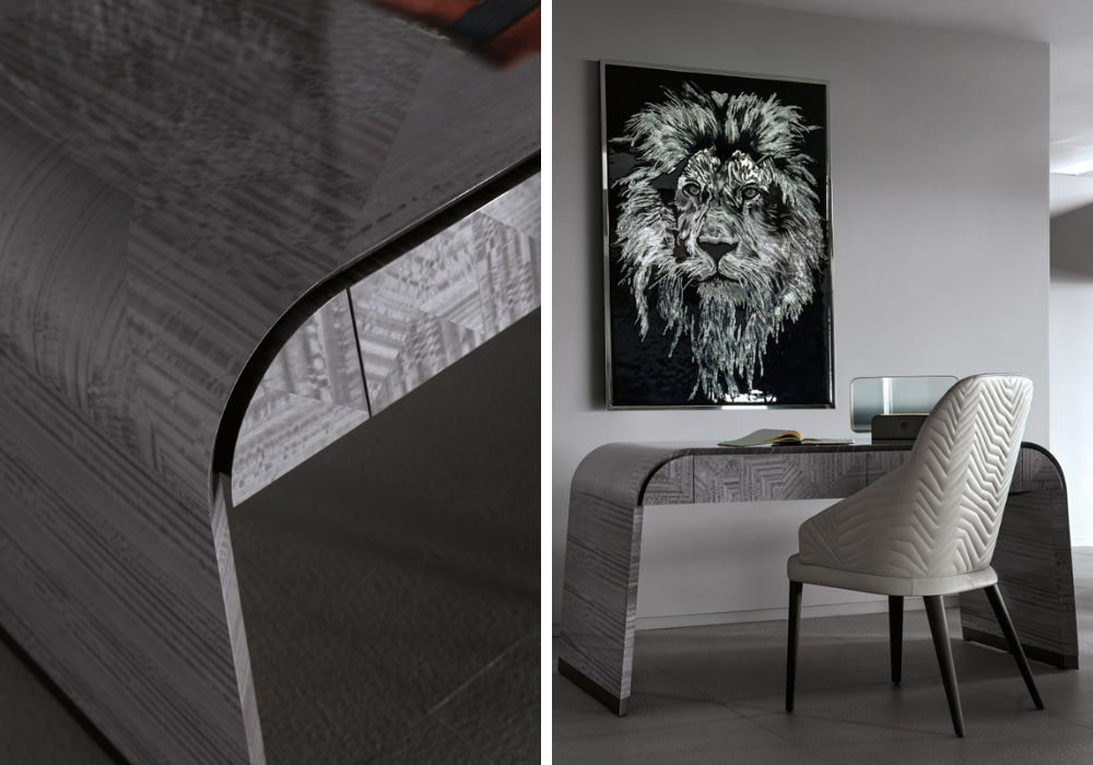 Moonlight nổi bật với vân gỗ bạch đàn xoăn Tasmania, trên nền màu xám nhạt tạo điểm nhấn thanh lịch. Chất liệu da và vải quý được chế tác tỉ mỉ, kết hợp với các đường may tinh xảo, mang đến vẻ đẹp tinh tế cho ghế sofa, giường ngủ và các sản phẩm nội thất khác. Khung sản phẩm được làm từ thép không gỉ mạ niken, đảm bảo độ bền và sang trọng.