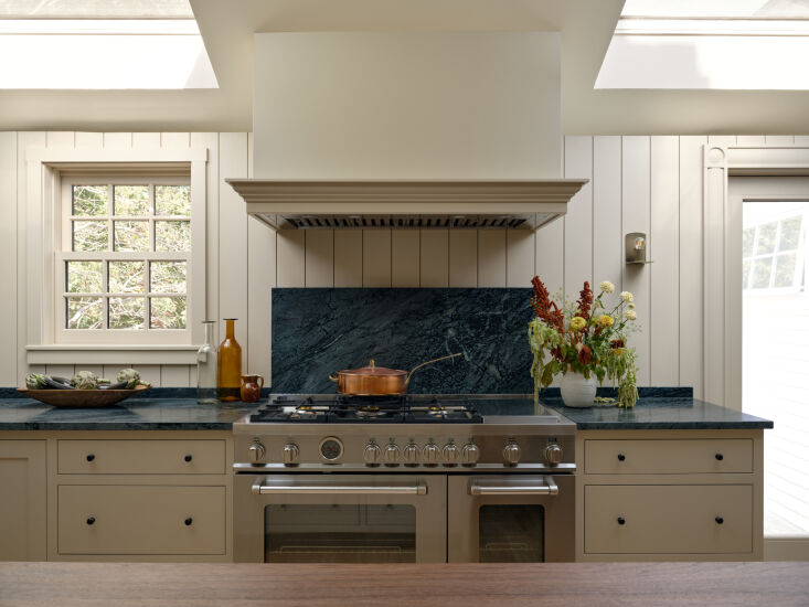 Vật liệu được lựa chọn theo tiêu chí bền vững và vượt thời gian: mặt bàn đá soapstone, gỗ óc chó và bảng màu trung tính dịu nhẹ. Sàn nhà được thay thế bằng gỗ sồi trắng nhằm loại bỏ sắc vàng của lớp sàn cũ, giúp tổng thể trở nên cân bằng và tự nhiên hơn.