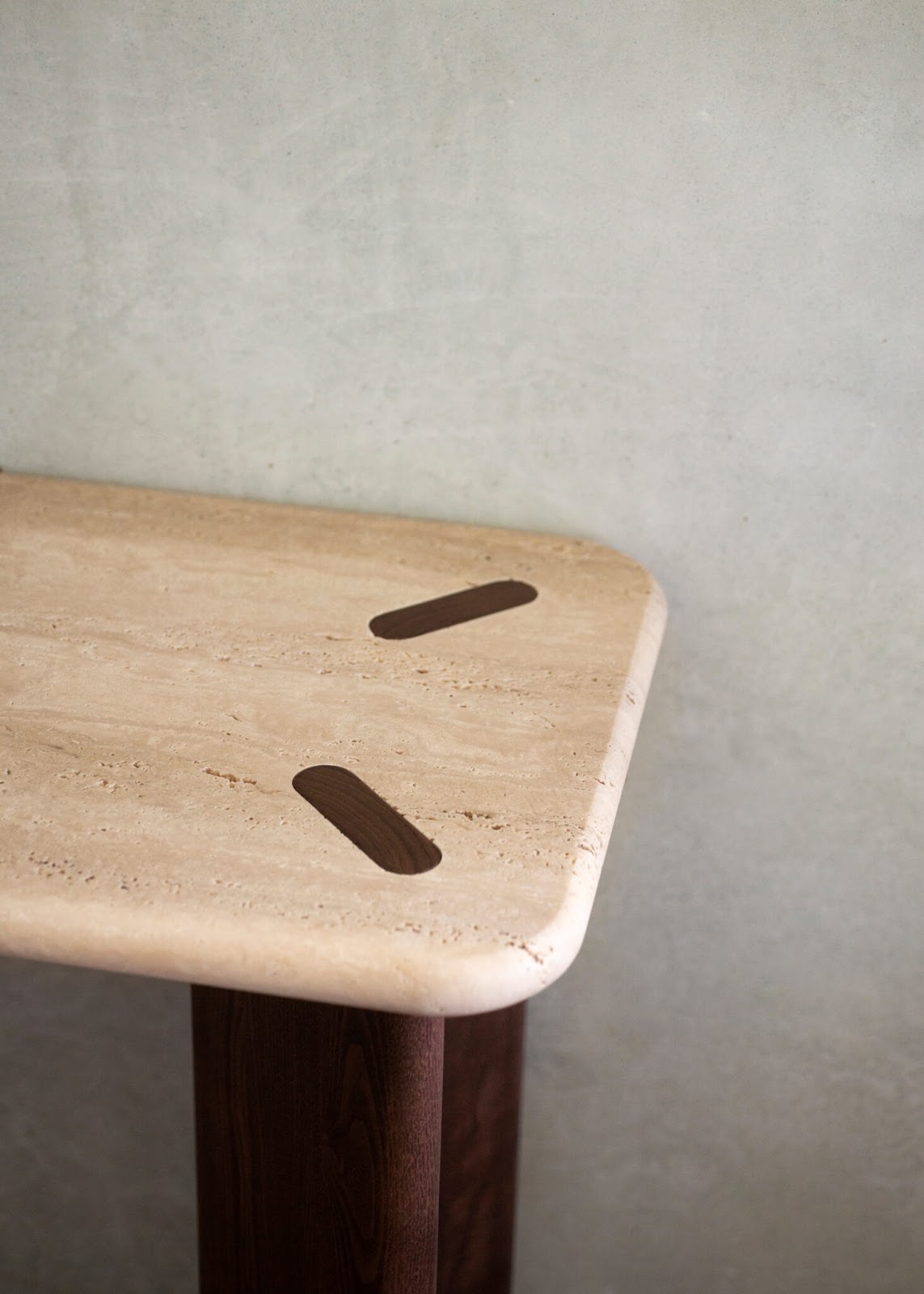 Sara Sbolgi và Marco Ferriani lựa chọn một chi tiết hình học tưởng chừng đơn giản: mối ghép giữa hai khối có tiết diện dẹt và bo tròn. Chính sự tương phản này tạo nên cảm giác vừa mềm mại, vừa chắc chắn – gợi liên tưởng đến tinh thần brutalism, nhưng được làm dịu lại bằng ngôn ngữ tối giản và tỷ lệ cân bằng.